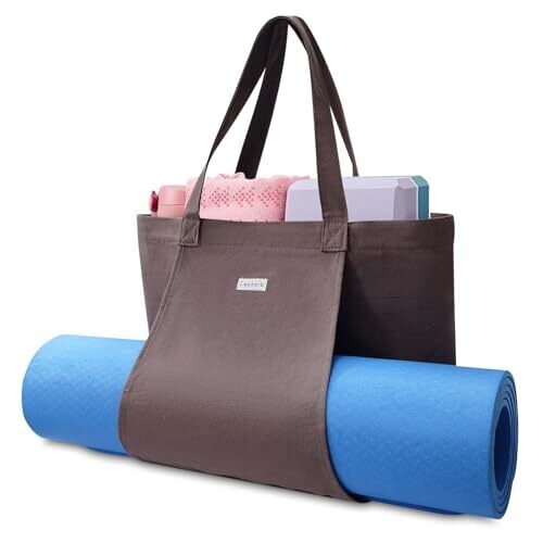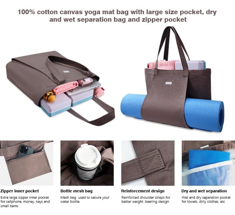 The Cwokarb Yoga Mat Bag is a versatile cotton canvas tote that carries your yoga mat and daily essentials. It fits towels, water bottles, clothes, blocks, and more, with multiple pockets, a water bottle mesh, and a roomy inner pocket.