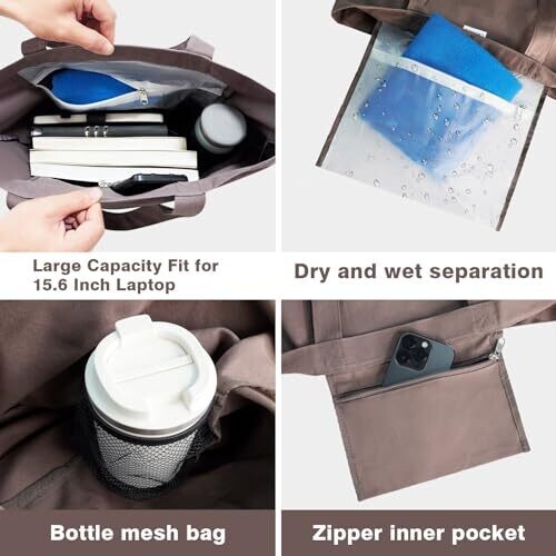 inner zipper pocket for cellphone, money, keys; wet and dry separation pockets for towels and dirty clothes; water bottle mesh holder; multiple pockets for accessories.