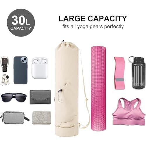 JIUSEGE presents a stylish yoga mat bag that carries your mat and essentials in one chic tote. It features double pockets for water, keys, phone, and more, with an adjustable strap for hands-free, comfortable carrying. Beige design fits everyone.