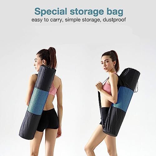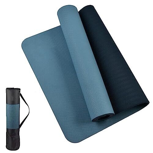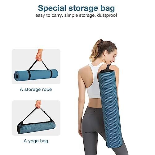 Eco-friendly TPE yoga mat, PVC-free and skin-friendly, provides comfortable practice. Features double non-slip texture with wavy undersides for solid traction, plus extra 6mm cushioning for joints. Comes with carrying strap and bag for easy transport, in stylish blue.