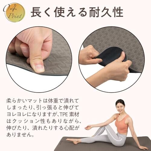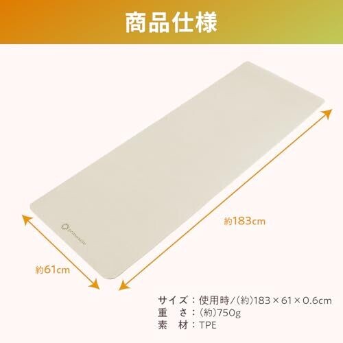 The product is made from thermoplastic elastomer (TPE), a material chosen for recyclability and reduced environmental impact. The mat features a double-sided non-slip design to minimize slippage during workouts. It is designed to be hygienic and easy to wipe clean, with a high-density composition intended to resist absorption of sweat and dirt. The mat is suitable for a variety of exercises, including yoga, pilates, stretching, planks, push-ups, and sit-ups. The color is Eccle Beige, and the thickness is 0.2 inches (6 mm). A carrying band is included for portability.