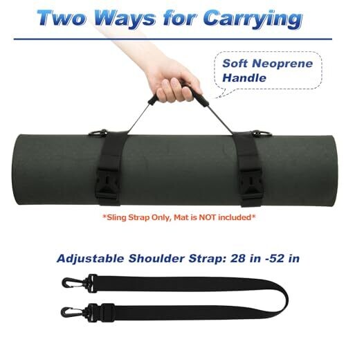 a soft neoprene handle for hand carrying and an adjustable strap that can be worn over the shoulder. The strap is made of nylon material for strength and light weight, with adjustable loops to prevent slipping. The design allows attachment to a motorcycle during travel and supports tying the strap around various items. The system is adjustable and compatible with mats of all sizes, with a classic black color suitable for various situations. It functions as a mat carrier intended for carrying and keeping a mat in practice, and is marketed as a multi-purpose accessory for workouts and travel.