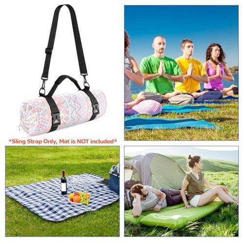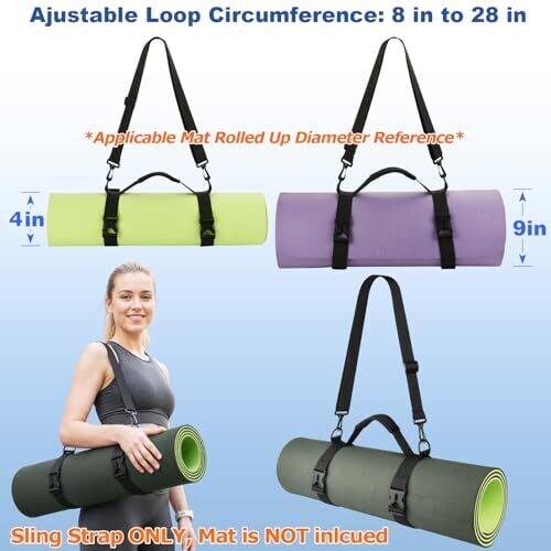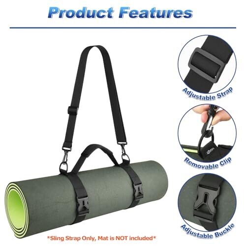 The product is an adjustable-length strap with two buckles to fit mats of different sizes. It is designed to hold a mat or blanket strap only (mat/blanket not included). It provides two carrying options: