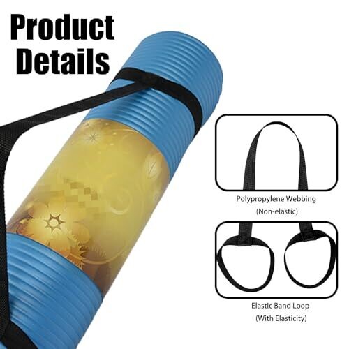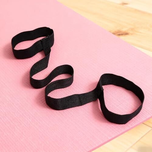 polyester-cotton fabric. Adjustable design with two end rings whose tightness can be freely modified to fit yoga mats of different sizes. Intended uses include storage and transportation of yoga mats, warm-up resistance band applications for yoga, Pilates, and fitness routines, and flexibility training. Care