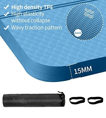 The nuveti exercise mat is available in thickness options of 15 mm, 20 mm, and 30 mm. Oversized dimensions are 72 inches by 32 inches or 78 inches by 36 inches. Material described as high-density foaming technology, tear resistant, wear resistant, and quick rebound. The mat is PVC-free, non-toxic, and eco-friendly, with a skin-friendly surface. The surface is textured to provide enhanced traction for stability during various movements. Care instructions include spot cleaning with cold water and mild detergent, and drying flat. The product includes a free carrying bag. Dimensions and thickness are intended to support joints, ankles, and knees on hard floors, and to absorb vibration and reduce noise during use. Suitable activities include yoga, Pilates, Bikram, fitness exercises, and general floor training. Returns are accepted within 30 days for full money refund with satisfaction after-sale service.