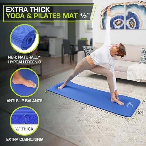 ProsourceFit Extra Thick Yoga and Pilates Mat provides generous padding and a long, wide surface for extended floor workouts. Ideal for at-home practice, it offers stability and comfort during yoga and Pilates, with a convenient carrying strap for easy transport.